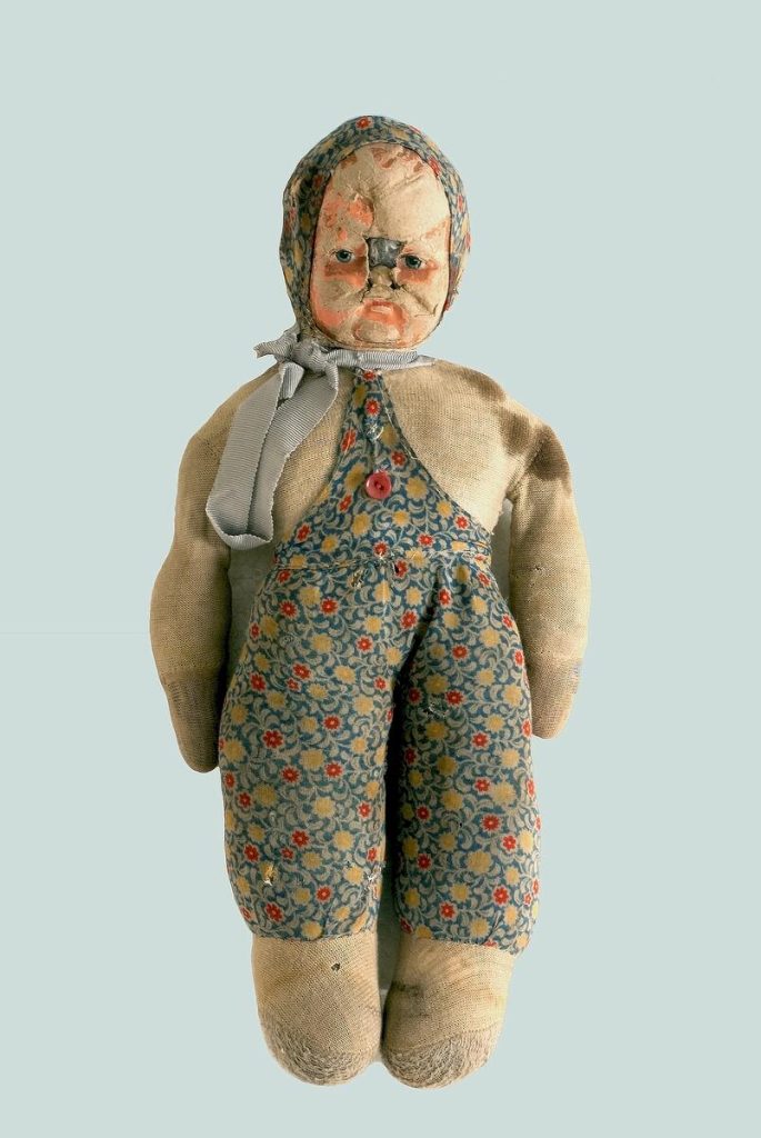 Dockans kropp är gjord av tyg, medan ansiktet är av bemålad papp. Men som ni ser har ansiktet nu delvis försvunnit vilket ger dockan ett olycksbådande utseende…