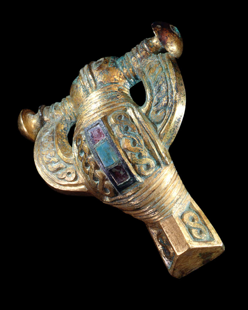 Spännet på bilden är större och mycket tyngre än de övriga smyckena i graven. På bygelns krön finns tre infällda stenar i cloisonnéteknik. De röda stenarna är sannolikt granat och den turkosa en bit av horn eller ben (den ljusblå färgen beror troligtvis på kopparsalter på ytan).